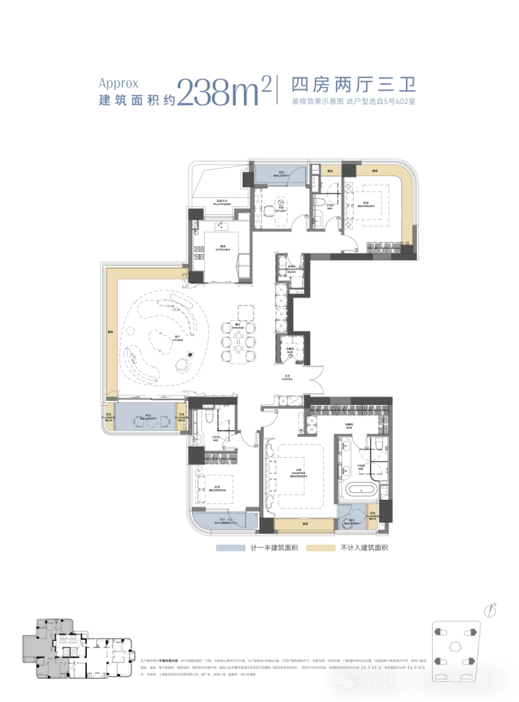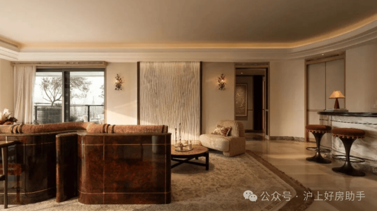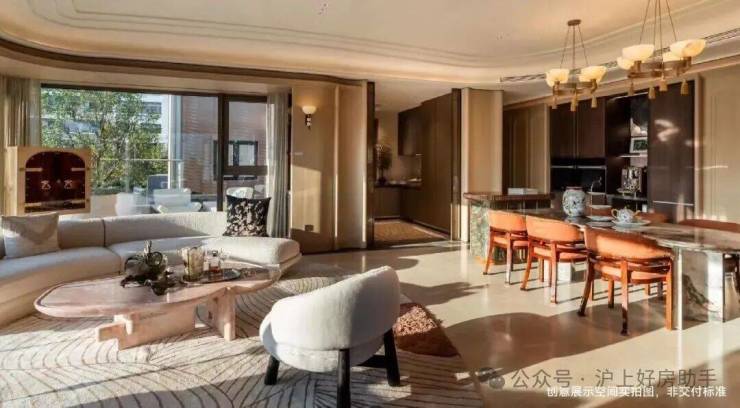 比如这个建面约238㎡户型,采用环幕设计,将徐汇滨江城市景观、下沉庭院等自然与人文景观尽收眼底,营造沉浸式居住体验。