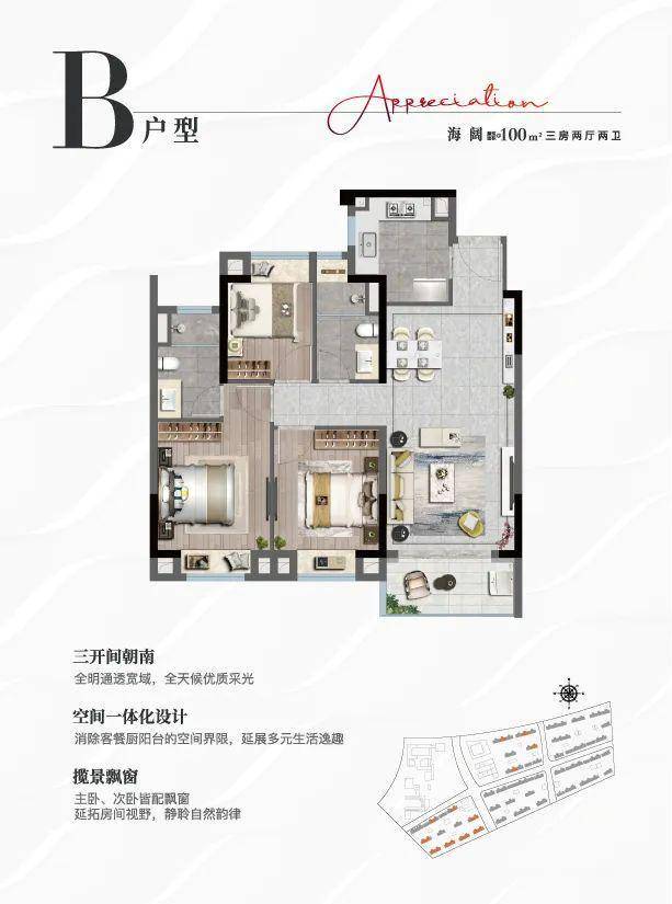 户型解析:三开间朝南,全明通透宽域,全天候优质采光;空间一体化设计,消除客餐厨阳台的空间界限,延展多元生活逸趣;揽景飘窗、主卧、次卧皆配飘窗,延拓房间视野,静聆自然韵律。