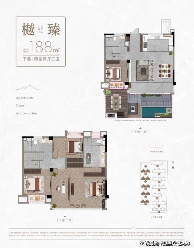 (3#5#7#9#11#13#小叠)中下叠建面:188平,四房两厅三卫(下叠送南向花园35平,中叠送北向花园15平)