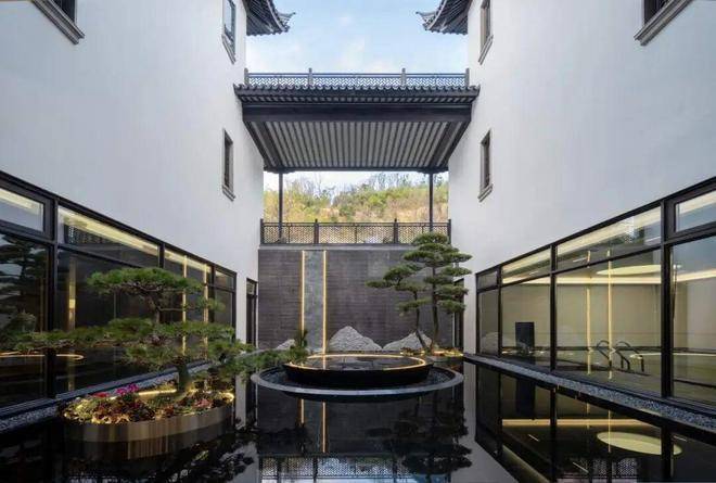 会所核心区是恒温泳池,也是东方疗愈泳池,更是颠覆传统社区泳池的设计逻辑:池底与内壁满铺蓝色玻璃马赛克,粼粼波光中与宋韵建筑的线条遥相呼应,雅致中透着顶奢质感;更难得的是其一体化设计——大幅落地玻璃窗将泳池与下沉式会所中庭景观无缝衔接,游泳时抬眼便能望见庭院里的东方绿植与光影流转,室内的静谧与室外的生机交融,这种“室内外场景一体化”的营造,正是顶奢酒店引以为傲的设计精髓;