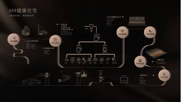 全屋配置6M健康智能住宅系统。这个智能系统系统涵盖降噪、净水、除湿、恒温、安智等多方面: