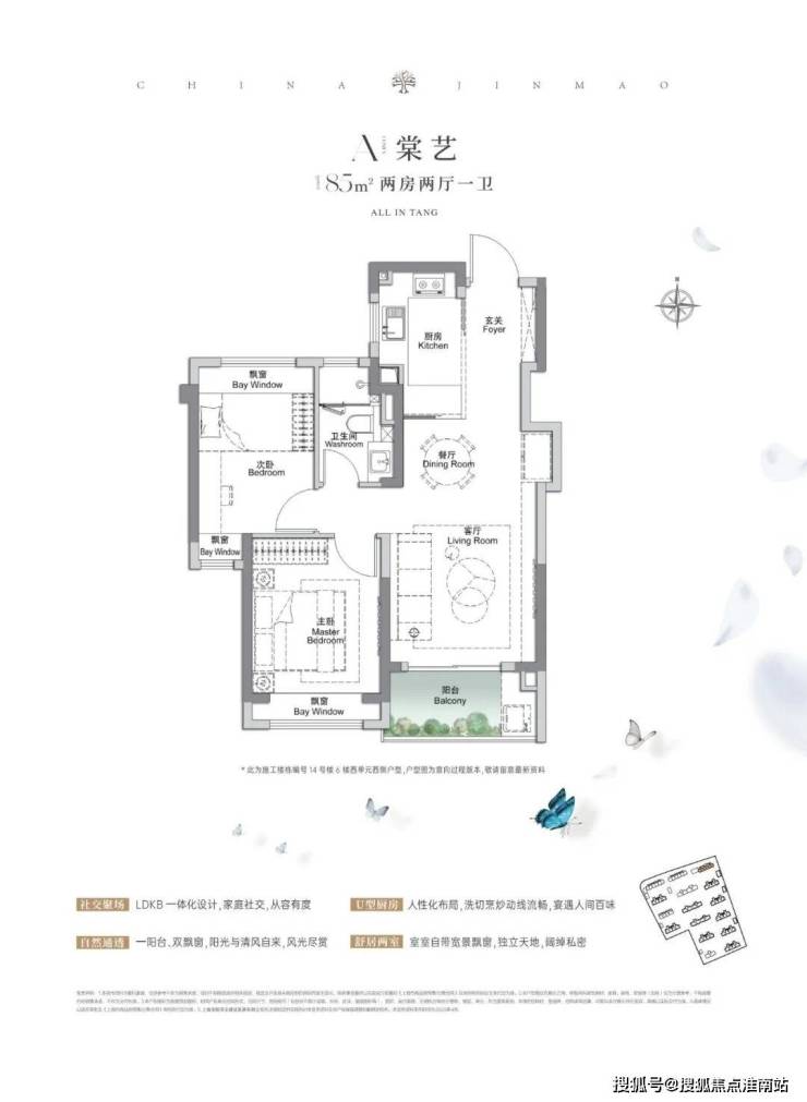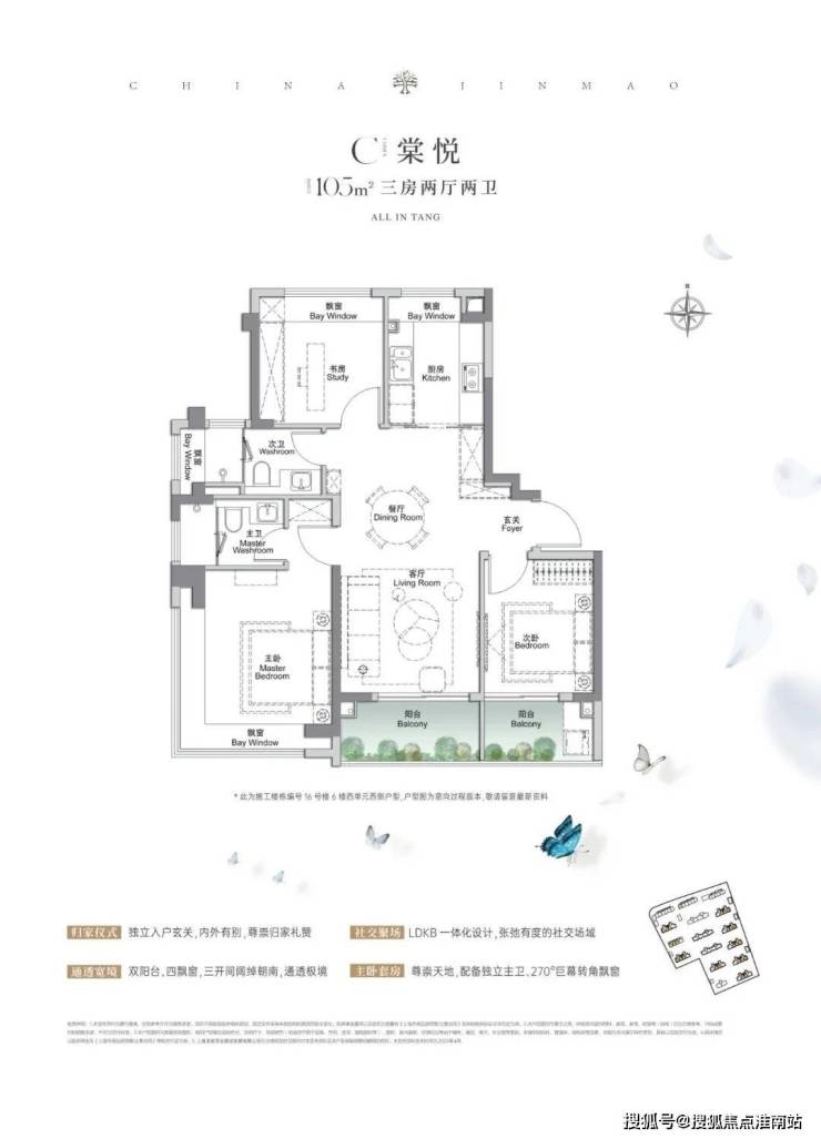 建面约105㎡3房2厅2卫,做到了 三开间朝南+4个飘窗+双面阳台系统+主卧套房设计+270°转角飘窗,该户型的居住体验、舒适度、尺度感,是同级别产品所无法比拟的。