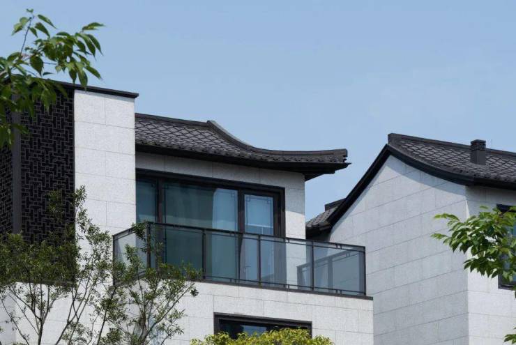 大丽和和中心中式美学院落的立面造型是在徽派基础上的当代表达,将古典建筑中粉墙黛瓦与自然景观之间形成色彩搭配与对比,结合现代风格建筑,打造形神兼备、有时代气息的新中式建筑。