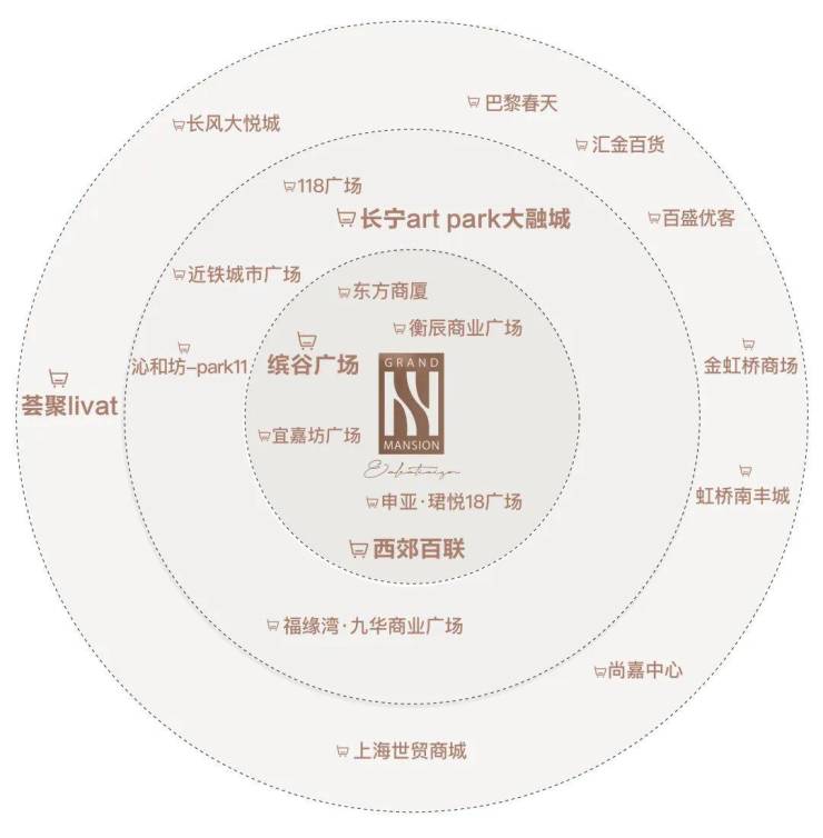 临近缤谷广场、百联西郊购物中心,东方商厦等老牌商业,3KM范围内涵盖金虹桥商场、上海荟聚、虹桥南丰城、尚嘉中心(LVMH集团投资)等超106万方商业综合体