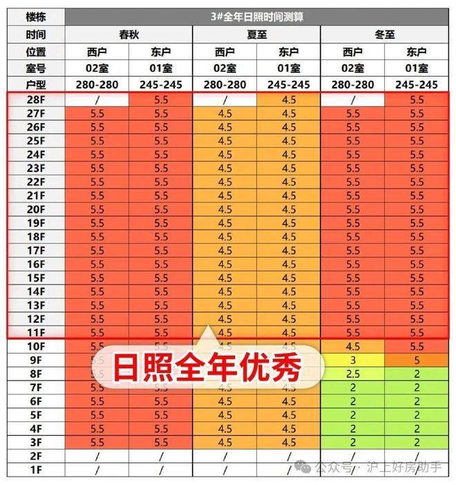 我们建筑师对3号楼全年日照做了测评,11楼以上几乎全年优秀日照,这在楼栋密集的上海内环内非常少见。