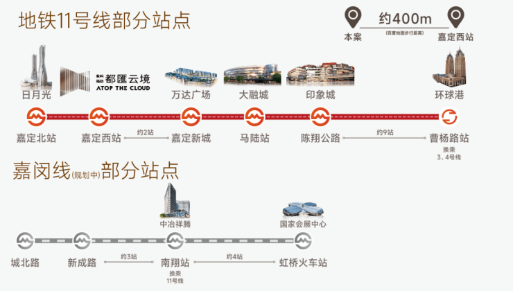 距离1公里以内已经相当少见,距离600米以内简直是凤毛麟角!象屿路劲 · 都匯云境距离11号线嘉定西路站仅约400米,是真正的步行进站地铁房。