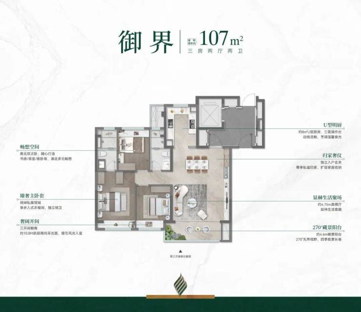 107㎡跃享精装“大平层”,约10.8m跃级南向采光+约28㎡ 通透方厅+U型明厨,真横厅不将就;