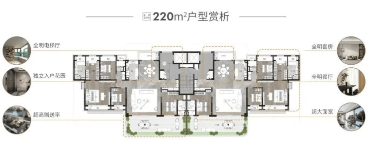 核心亮点: 一梯一户、超大面宽、独立入户花园、超大南向空中庭院赠送。