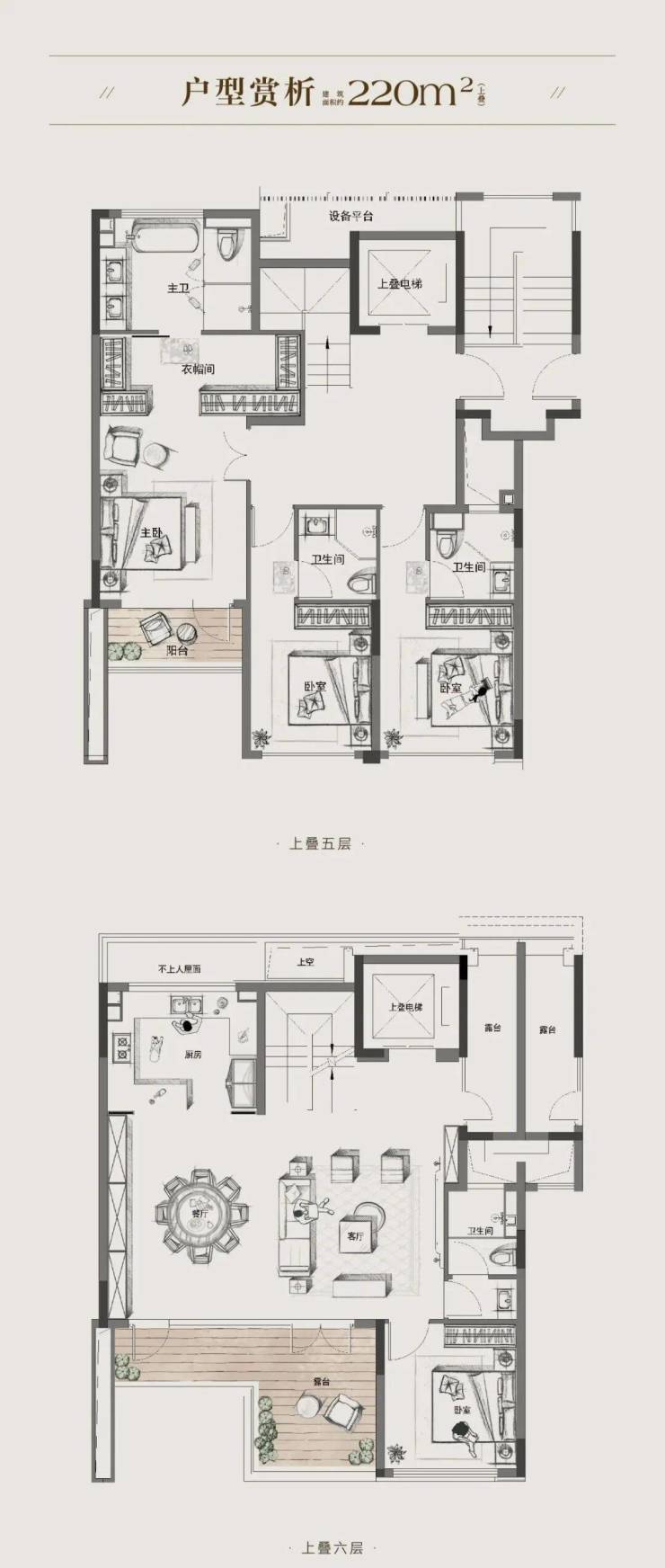 空中别墅:高层顶复,带超大露台,视野无敌。