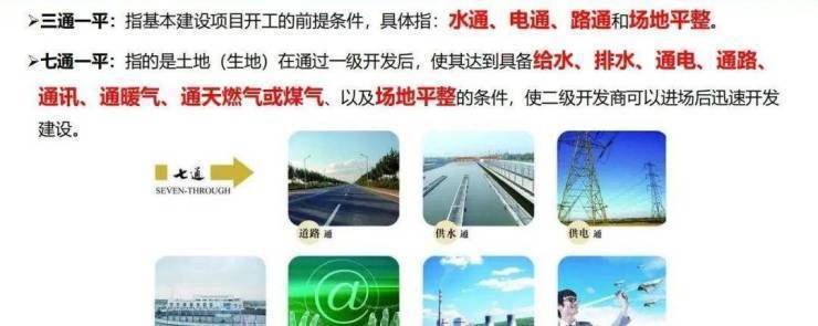 是指上、下水通,排污通、排水通、路通、通讯通、煤气通、电通及场地平整。