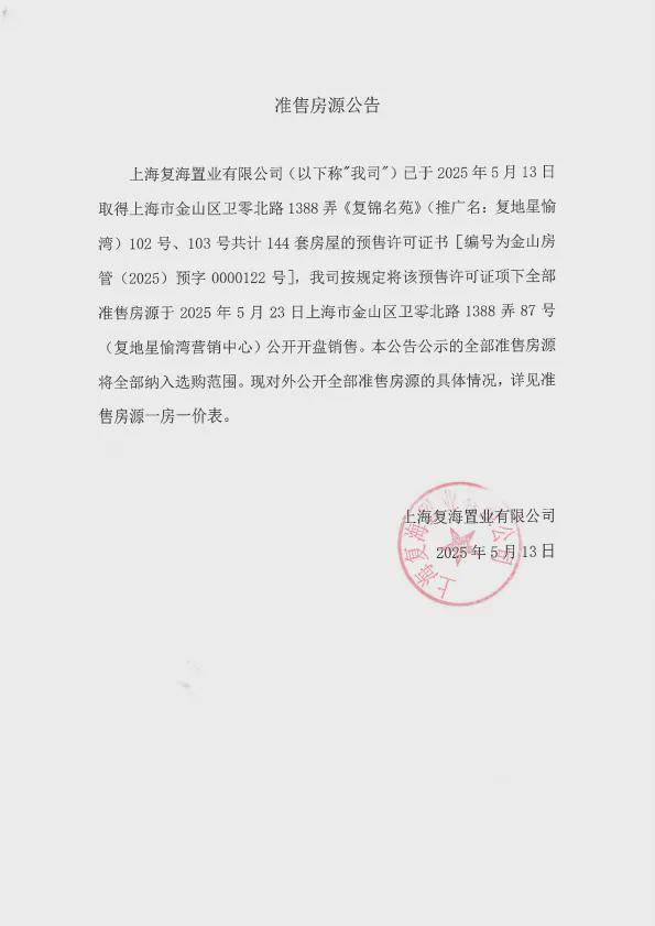 本项目的推广名为"复地星愉湾",备案名为"复锦名苑",开发公司为"上海复海置业有限公司"。预售证号:金山房管(2025)预字0000122号。