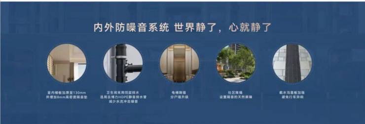 内外防噪音系统:室内楼板加厚至130mm、卫生间采用同层排水并增加8mm高密度隔音垫、电梯降噪分户墙升级、社区降噪设置隔音的天然屏障、截水沟盖板加强避免行车异响...