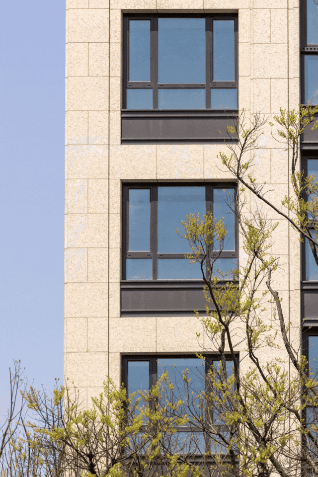 项目外立面质感很特别,采用浅色系全石材干挂,巴西都伯斯金麻、宏宇金麻搭配铝板线条,看盘当天天气不错,在阳光照耀下,立面闪烁着温润光泽。
