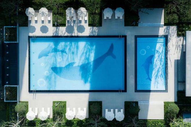 视线流转间,一方超400㎡蓝宝石泳池在阳光下熠熠生辉,水面倒映的云影与池底海豚图案相映成趣。