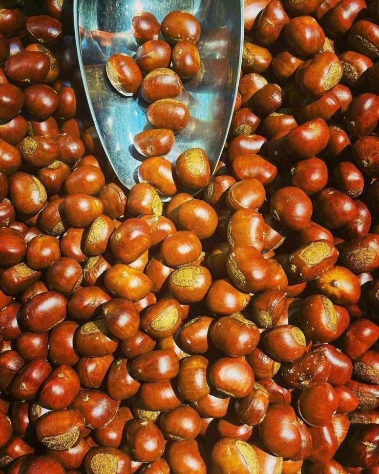 剥开外壳,栗子肉软糯香甜,带着焦糖的香气,暖乎乎地捧在手里,是街头最温暖的味道。
