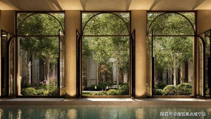 NO.8花园泳池波光潋滟处,拱形门窗外花影摇曳,一池春水将四季芳菲溶成流动的油画.
