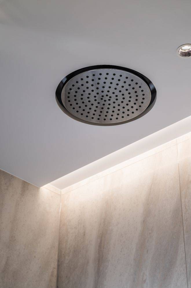 主卫淋浴花洒采用了德国当代Dornbracht,并做了别具一格的嵌入式设计。花洒的底面与吊顶齐平,视觉与空间感更好。