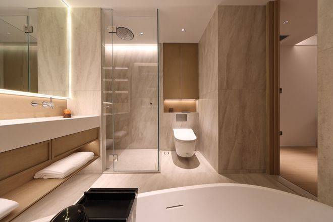 主次卫内的水龙头,也都配置了德国当代Dornbracht的墙出式水龙头,墙出式水龙头的采购成本要高于同等品牌的台面龙头。与龙头搭配的,是设计师定制的极简风的双台盆一体化洗漱台和独立式浴缸。