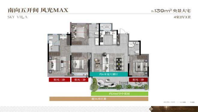 大面宽也营造了更为明媚的家庭公区。约6米宽尺大横厅连接南向空中花园,周末与亲友相聚,阳光倾泻而入,甚至都不需要开启主灯。