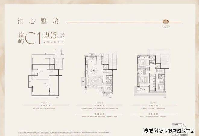 户型特点:下叠边套,南向面宽约9米,客餐厅同宽约5.8米,空间开阔。一楼设南向卧室,采光好且视野佳。二楼为三套房+主卧总统套房设计,主卫南向,可容纳浴缸和双台盆。地下室方正,附赠采光井,利用率高。