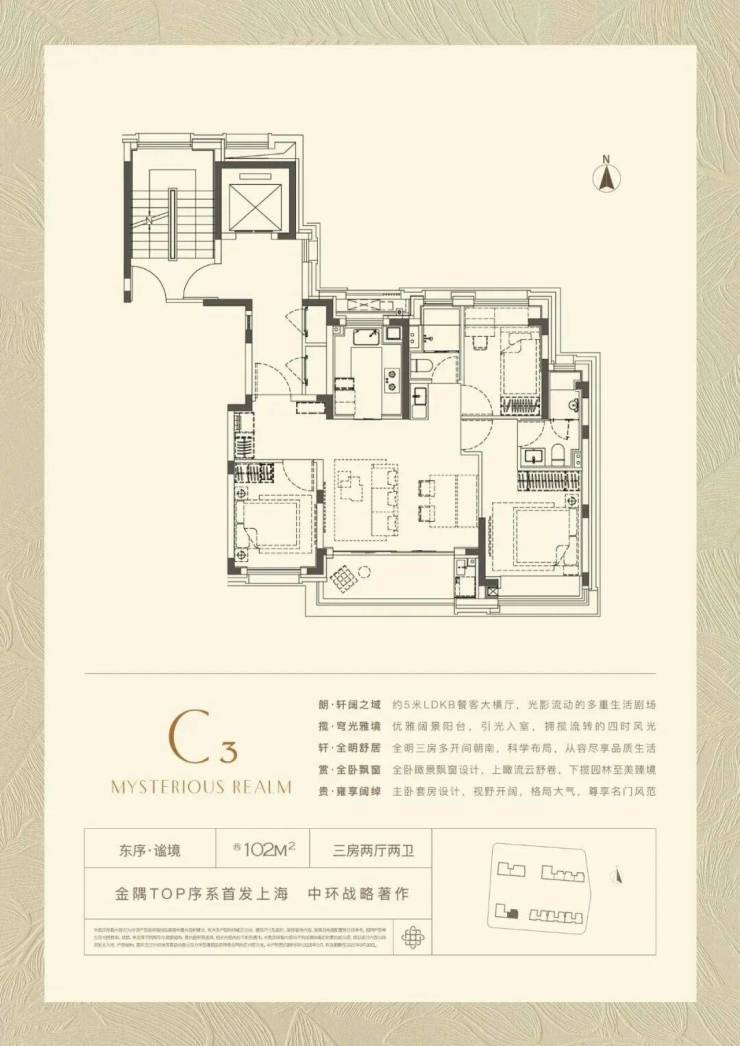 建面约102㎡的三房两厅两卫,在百平米内颠覆性地实现了5米奢阔横厅,飞机户型布局极致高效,成就了采光、观景与空间利用率一步到位的全能之家。
