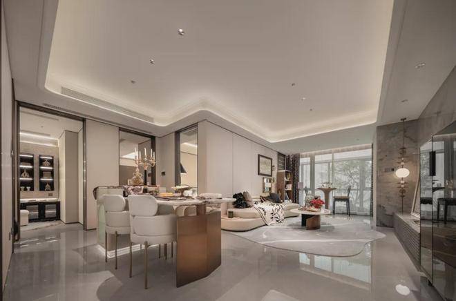 项目首层通过硬朗直线呼应柔和曲线勾勒,辅以温润石材与古铜色金属线条融合,打造东西方美学共融的艺术藏品