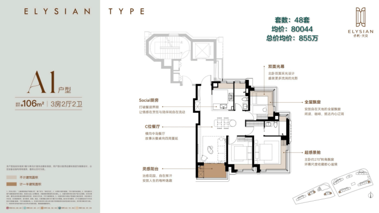 第二个户型,106㎡边套户型,三房两卫,同样满飘窗赠送+大餐厅空间设计,主卧+北次卧双270°转角飘窗设计,均价正好是8万/㎡,但是请注意这个户型是2层起步。