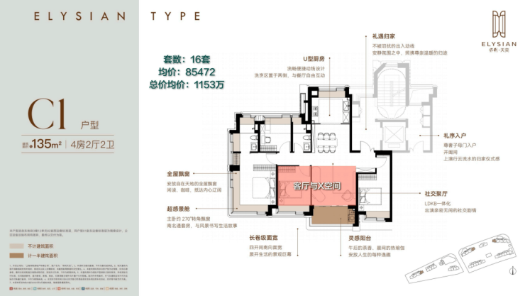 135㎡户型同样没有一层房源,总价则是千万起步,最高不超过1200万,对于改善客户来说是一步到位的选择。