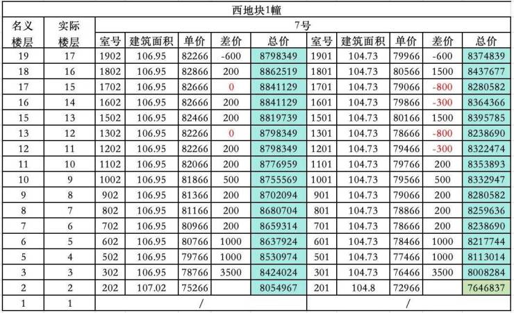 我们具体来看一下这次楼层之间的价差逻辑,三栋楼楼层价差逻辑基本一致,我以西区1幢西侧的7单元为例。