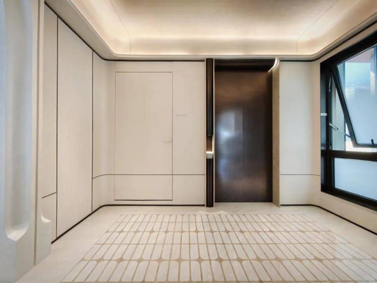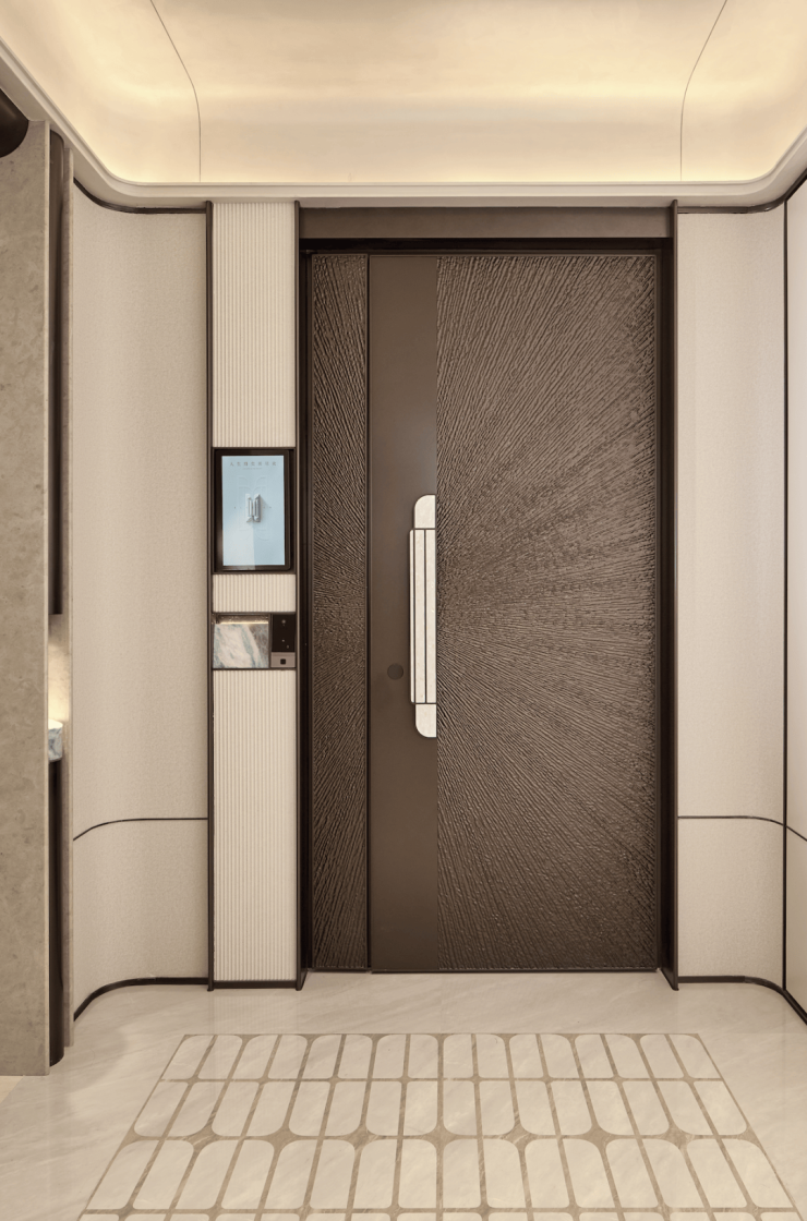 另外,除了前面提到的全明电梯厅以外,所有四房户型的电梯都是双开门设计,电梯厅空间都是不共用的,从而实现了「类一梯一户」的独立电梯厅设计。此外,铸铝门也升级成了「子母门」。