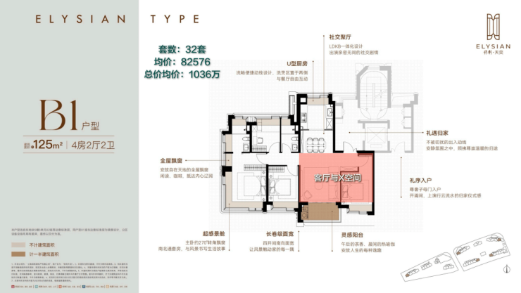 第三个户型,125㎡边套户型,四房两卫,项目王牌户型,四开间朝南+9个飘窗满飘窗赠送+主卧&主卫双270°转角飘窗设计,均价8.26万/㎡。
