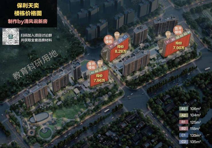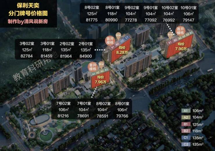 注意:保利天奕首开三栋楼的一层要么是架空层,要么是非标户型,三个标准户型中只有104㎡中间套有一套一层房源,其他标准户型的房源起步都是2层,最高17层,所以除了104㎡户型的最低最高价差在85折,其他几个标准户型的价差基本在88/89折,价差是比较合理的,整体来说价差不算大。