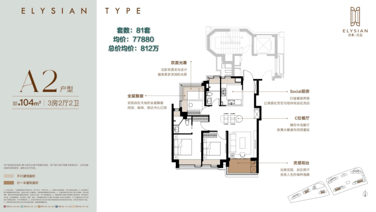 第一个户型,104㎡中间套户型,三房两卫,6个飘窗满飘窗赠送+北次卧270°转角飘窗,半开放式厨房+大空间餐厅+S墙设计,均价是所有户型中最低的7.79万/㎡。