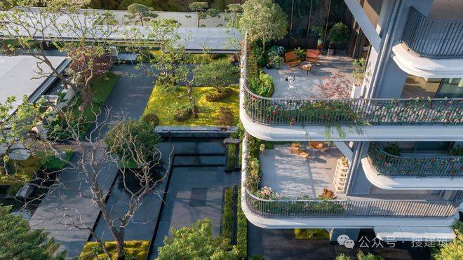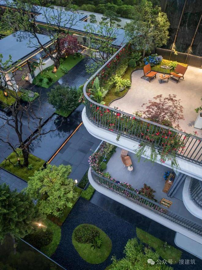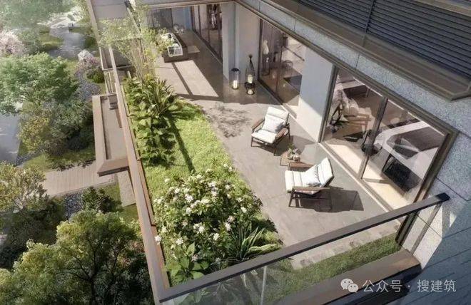 龙湖苏州未来御湖境创新奇偶错层空中花园设计,实现观景和采光平等化,南阳台(露台)能做到挑高约6米,,最大程度可享有 270°转角露台,每家都有一座私人花园。