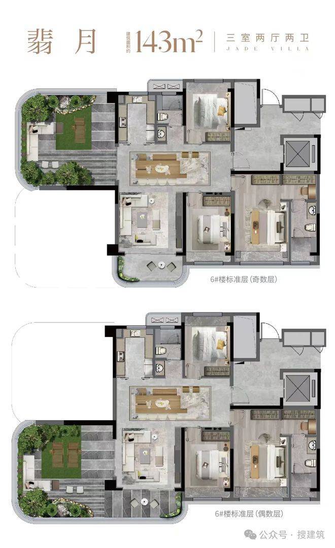 空中庭院奇偶层露台错开,打造出建面约143㎡奇偶户型,四房两厅两卫。