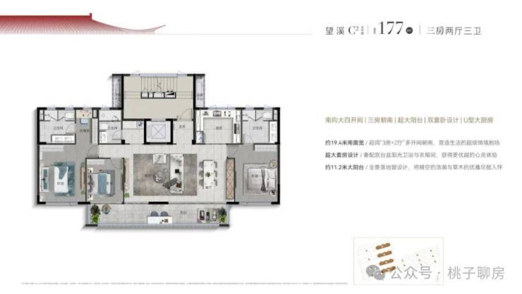 【旷尺面宽】三房朝南或两房朝南格局,以巨幕空间,迎阳光与风光入室。
