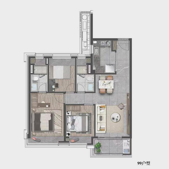 建面约99㎡3房2厅2卫户型图: