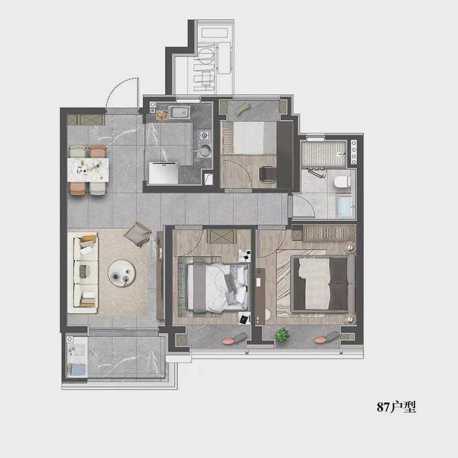 建面约87㎡3房2厅1卫户型图: