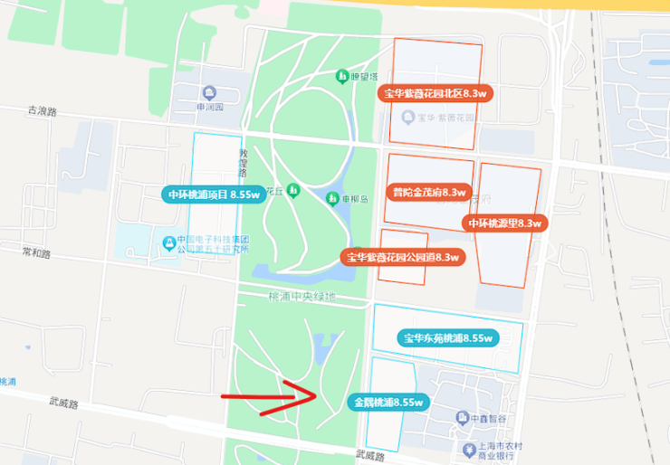 整个项目包含两个地块,地理位置就在宝华紫薇之星南侧,联动价8.55万元/㎡。这块地是2023年四批次土拍时由金隅地产拿下,也是紧挨桃浦绿地的景观房。