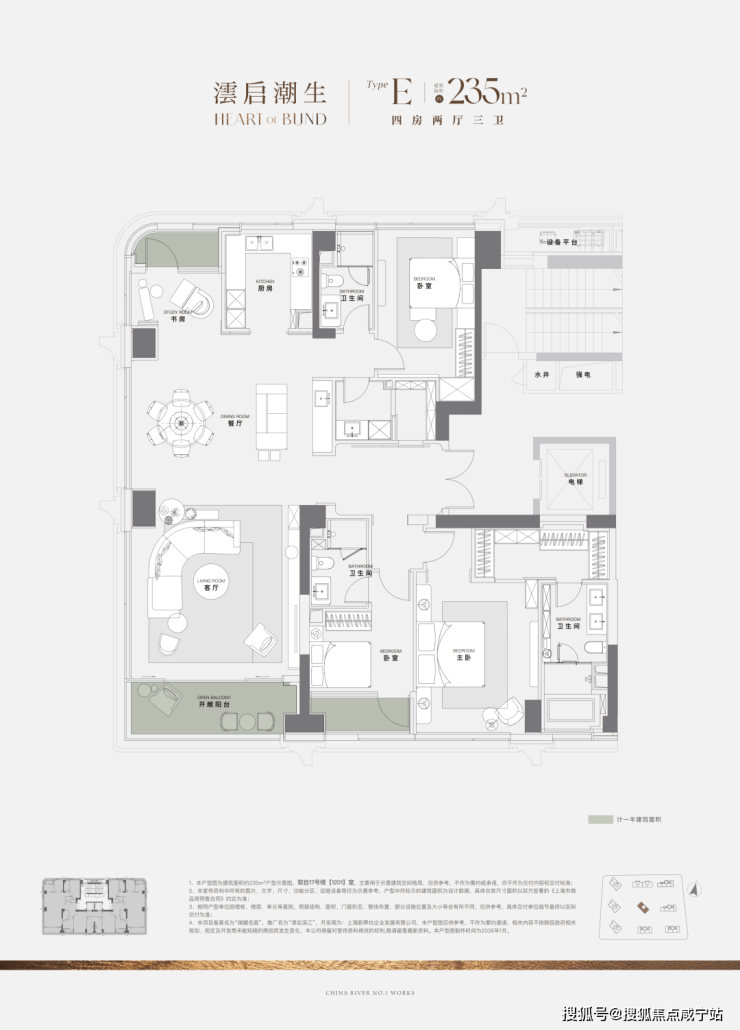 过去10年上海一线滨江住宅,大户型是绝对主流,120㎡级3房产品从未出现。澐启滨江是因2021年后滩九宫格有中小套型指标要求,得以推出120㎡级产品。