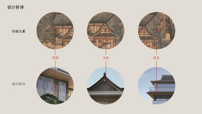 设计中,源引宋式建筑及园林意境,追溯典雅清逸的美学理念,将宋代建筑及构筑物特征进行现代化演绎,形成独特的符合现代审美的建筑风格及建筑空间。