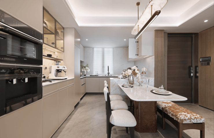 装修方面,139平户型三大件标配,日立中央空调、迈迪龙新风、菲斯曼地暖,厨房配置老板四件套、3M末端净水器,还是最近很流行的三眼灶,内嵌洗碗机和蒸烤一体机,卫生间品牌高仪/科勒/恩仕,全屋智能马桶,全屋智能家居系统,整体精装较限价时期升配明显。