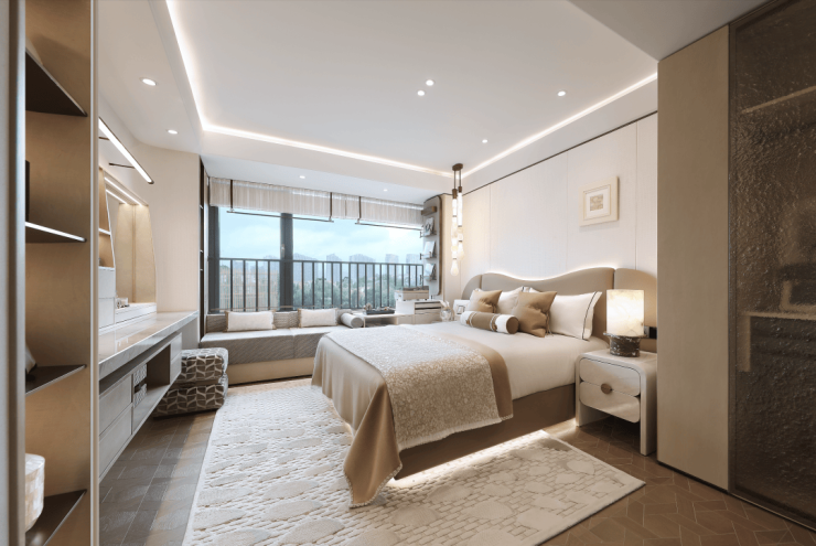 在春来晴翠园建面约169㎡晴翠户型中,最亮眼的设计显而易见——主卧90°转角窗,揽获270°环幕视野,将天光云影尽纳室内。不仅引入绝佳采光与风景,更成为一处心灵栖所。