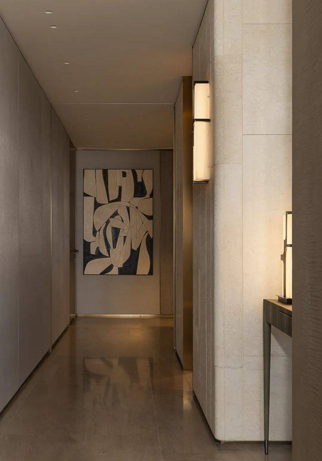✅万科中興傲舍营销中心热线4008558224(官方预约看房热线)进入室内的入户玄关收纳空间,地面采用静雅棕、宝格丽兰石材拼花设计古典回形波打+实心铜条的搭配增强入户尊贵感。右侧是山水白奢石的开放格,左侧是行李间,通过暗门的做法,将功能结合进去,强化了归家的仪式感。