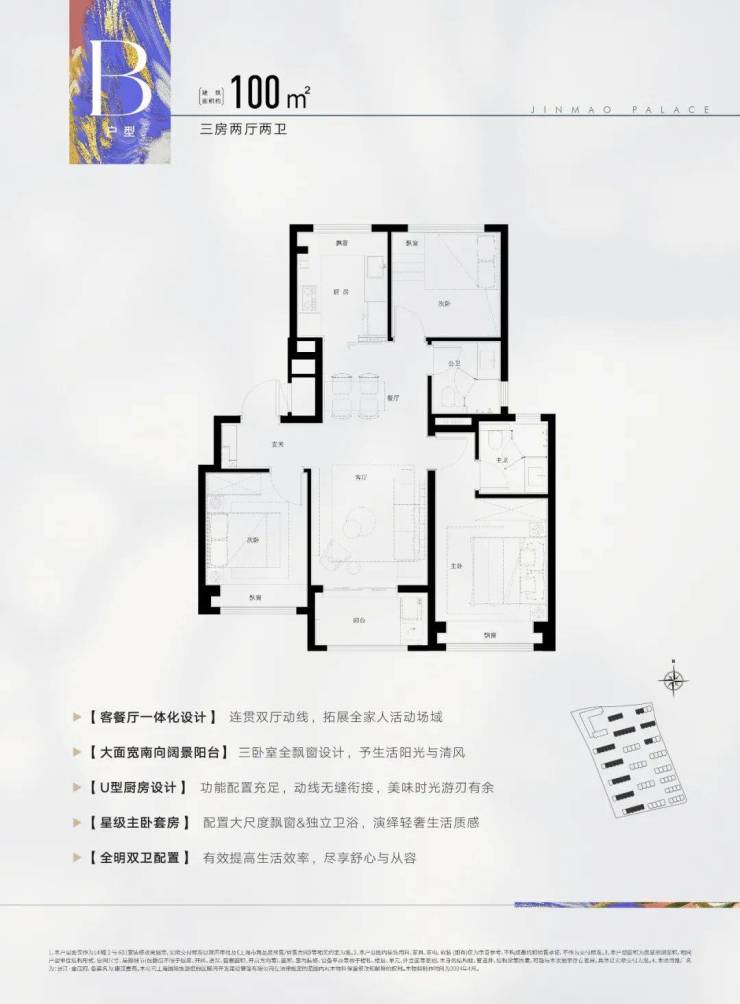 建面约100㎡3房2厅2卫户型