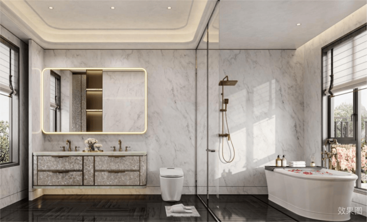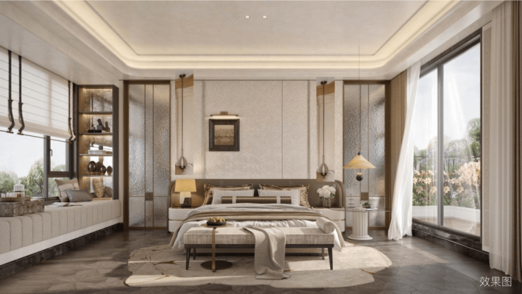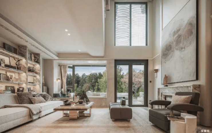客餐厅、南向次卧、独立主卧层层配享同等尺度面宽,充分将全天日照最大限度地纳入室内。巨幅落地玻璃窗如同取景框,将庭院绿意无缝衔接入内,最大化确保了每位家庭成员都能平等地享有阳光与观景的权利。