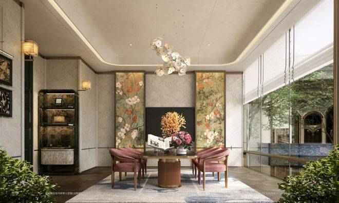 以玉兰门庭—迎归大堂—莳花荟为主轴,敬献步履生辉的归家艺旅:玉兰门庭如繁花盛绽,尊华瑞鳞水景聚运生财,双尊铜狮镇守家宅;迎归大堂流转光影艺韵,百羽栖澜艺术雕塑、芦海宸韵非遗绣作流淌摩登气韵;莳花荟中央会客厅移步异景,献映会客、休闲等雅会。