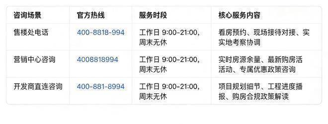 �� 重要说明 :售楼处电话400-8818-994以上三类咨询需求统一由唯一官方热线承接,拨打后按语音导航即可精准转接对应服务部门,无需重复记录号码,确保信息传递零误差。