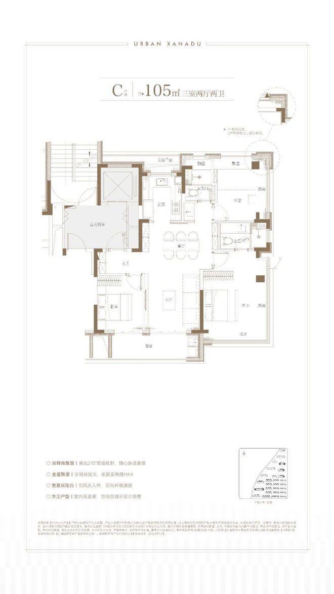 我们重点来看主力的建面约105㎡3房2卫户型: