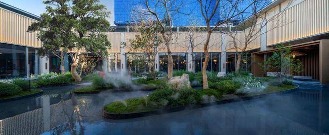 步入社区,首入眼帘的是6米高水幕的下沉式山水庭院,与周围建筑融为一体,将自然与松弛感带给社区。